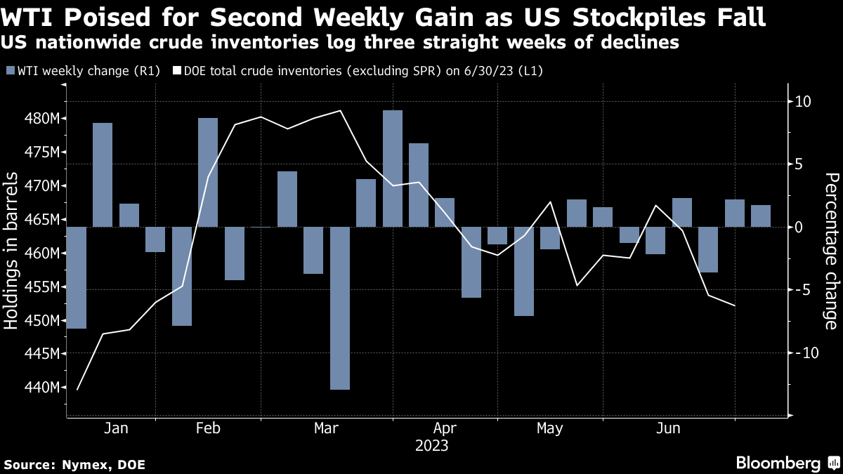 West Texas Intermediate edged above $72 a barrel, on course for a weekly advance of nearly 2%. The US crude benchmark is set for the first back-to-back weekly increase since late-May, with near-term time spreads flipping into a narrow backwardated structure, a bullish pricing pattern.