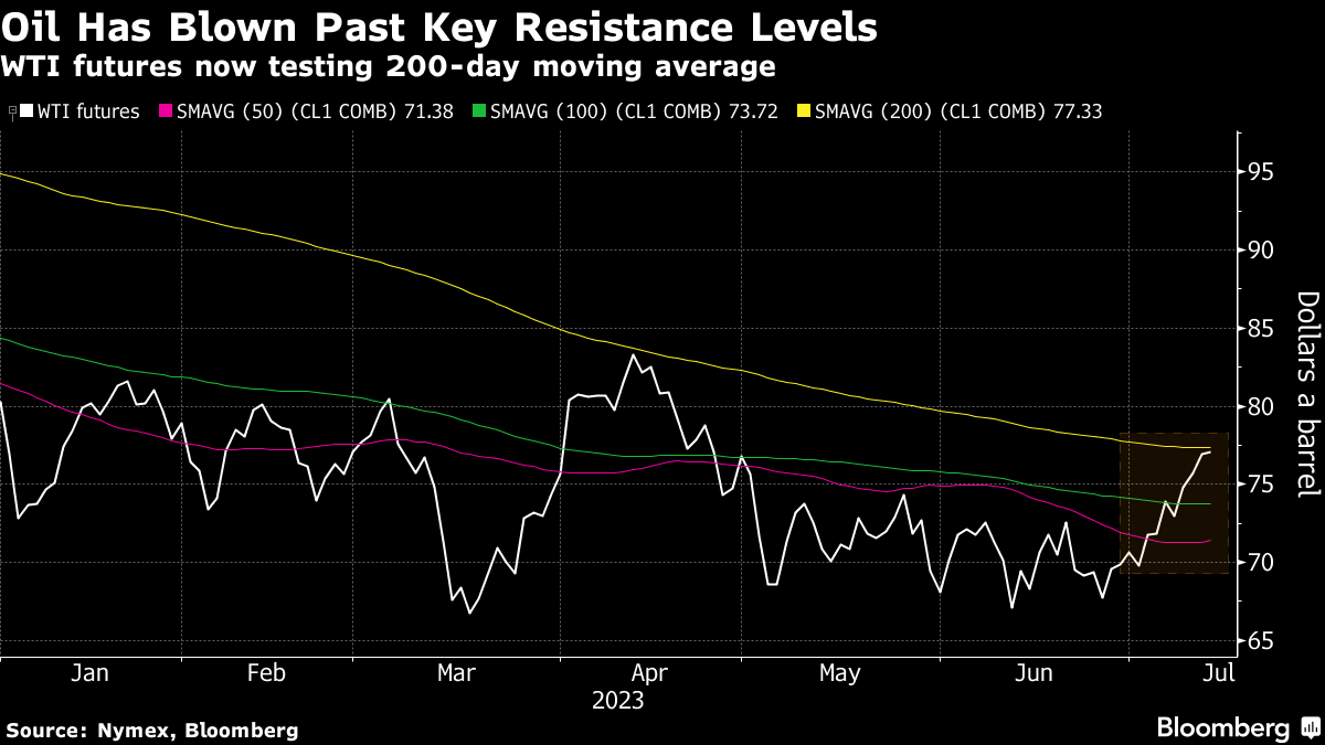 West Texas Intermediate futures traded near $77 a barrel on Friday and are around 4% higher this week. Libya’s second-biggest oil field is in the process of shutting due to protests, while there’s also a production halt in Nigeria. That follows signs that resilient Russian flows are finally starting to ease.
