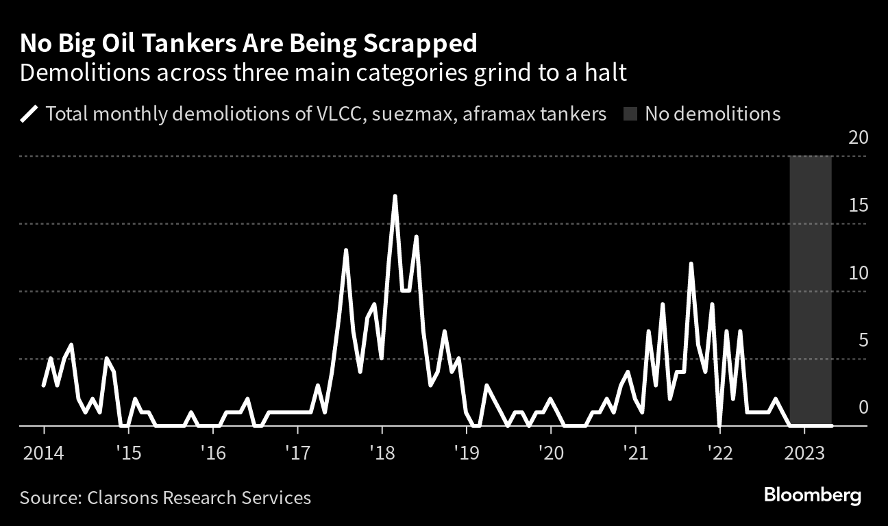 The surge in demand for ships has extended the lifespan for many. Not a single large crude tanker has been scrapped for seven months, something that hasn’t happened since at least the mid-1970s, according to Clarkson Research Services Ltd., a unit of the world’s largest shipbroker.