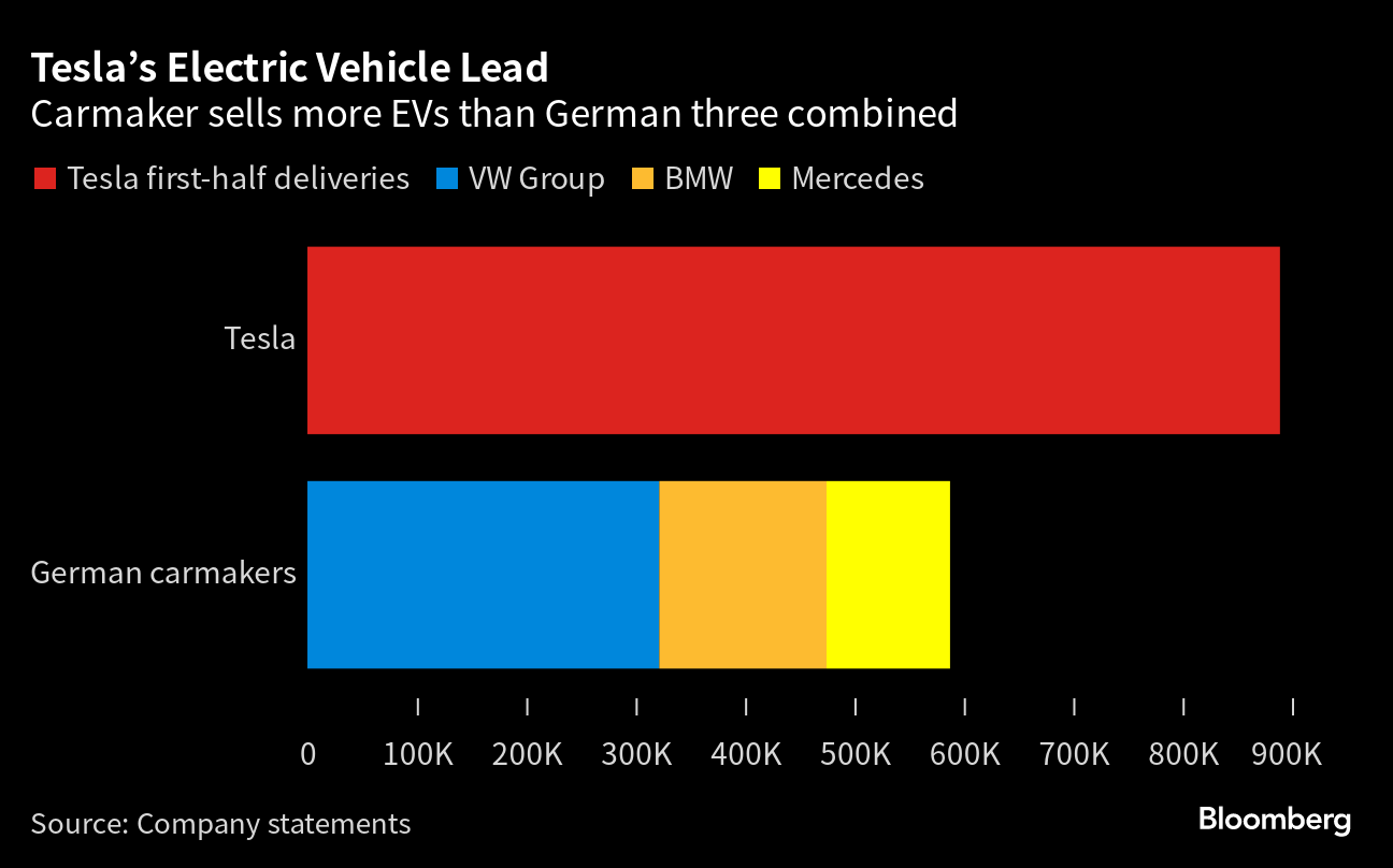 Tesla delivered 889,015 cars in the first half of this year, more electric vehicles than Volkswagen AG, BMW AG, Mercedes-Benz Group AG and Porsche AG sold combined.