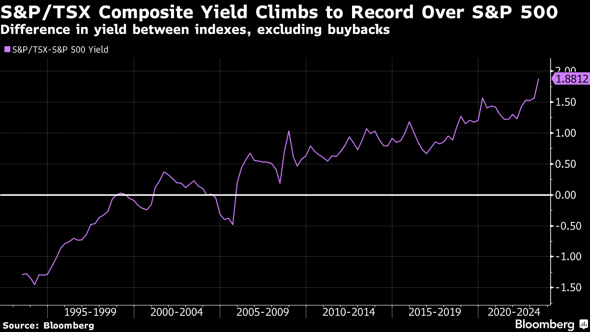 Stocks in Toronto have offered heftier dividend yields since 2005, according to data compiled by Bloomberg. The US market, by contrast, has consistently offered investors bigger returns via share buybacks.