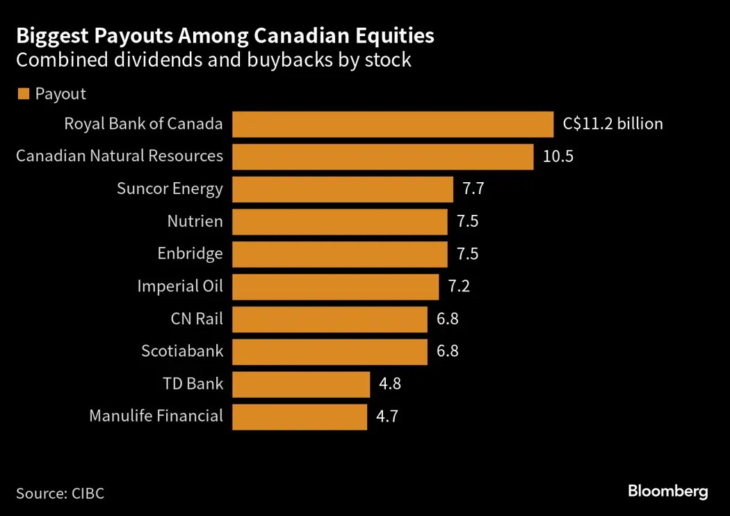 Boosted by higher energy, fertilizer and metals prices, total payouts including dividends and buybacks by S&P/TSX-listed firms reached a record C$170 billion over the last 12 months, CIBC calculated.