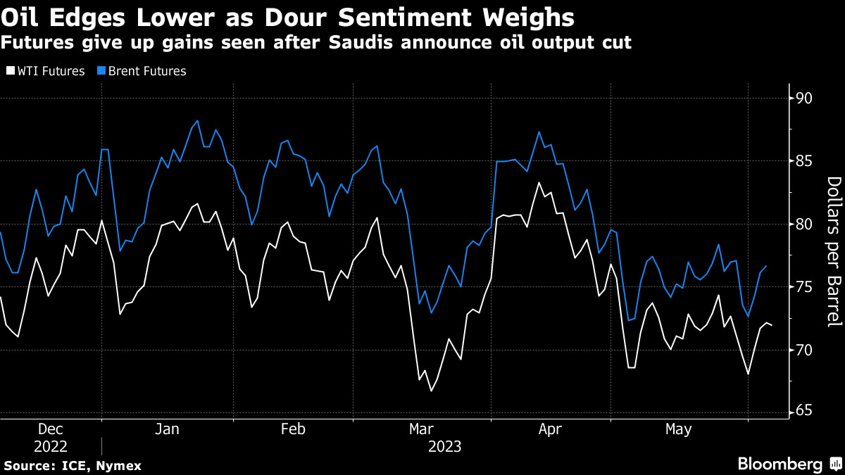 (Bloomberg) -- Oil edged lower as traders weighed the outlook for supply and demand after Saudi Arabia’s surprise pledge for extra supply cuts.