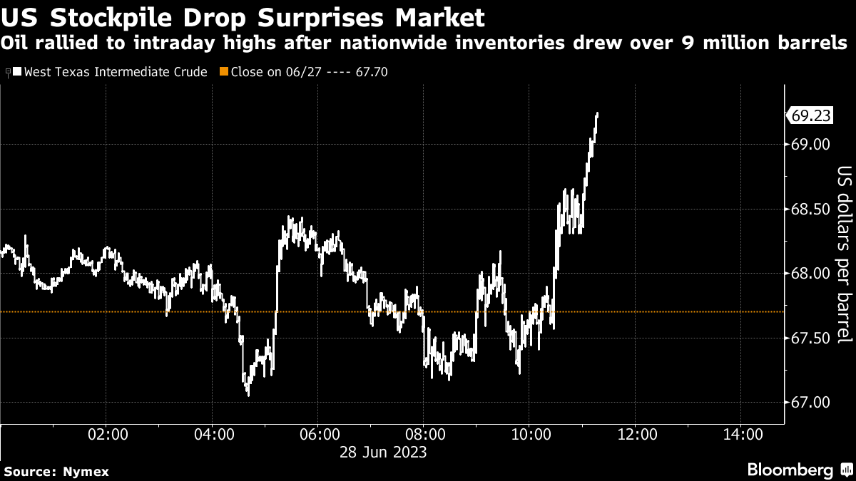 US crude stockpiles fell 9.6 million barrels last week, the Energy Information Administration said Wednesday. In another bullish data point, gasoline demand rose to the highest since December 2021 on a four-week average.