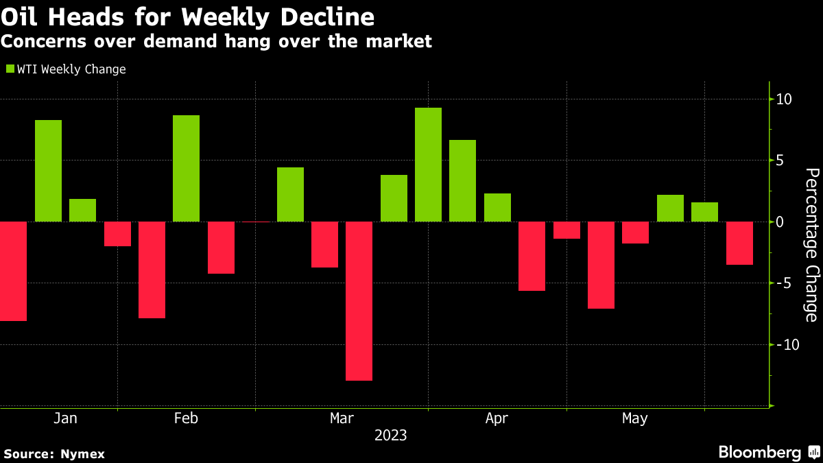 While West Texas Intermediate rose toward $71 a barrel on Friday amid a risk-on tone, futures are still down around 3% for the week. OPEC+ gathers over the weekend to discuss the group’s production policy against the backdrop of a sluggish economic recovery from China, despite the end of Covid Zero.