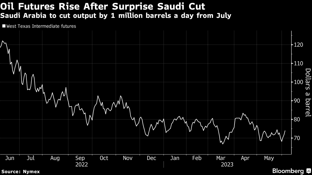 (Bloomberg) -- Oil advanced at the week’s open after Saudi Arabia said it will make an extra 1 million barrel-a-day supply cut in July, taking its production to the lowest level for several years following a slide in prices.