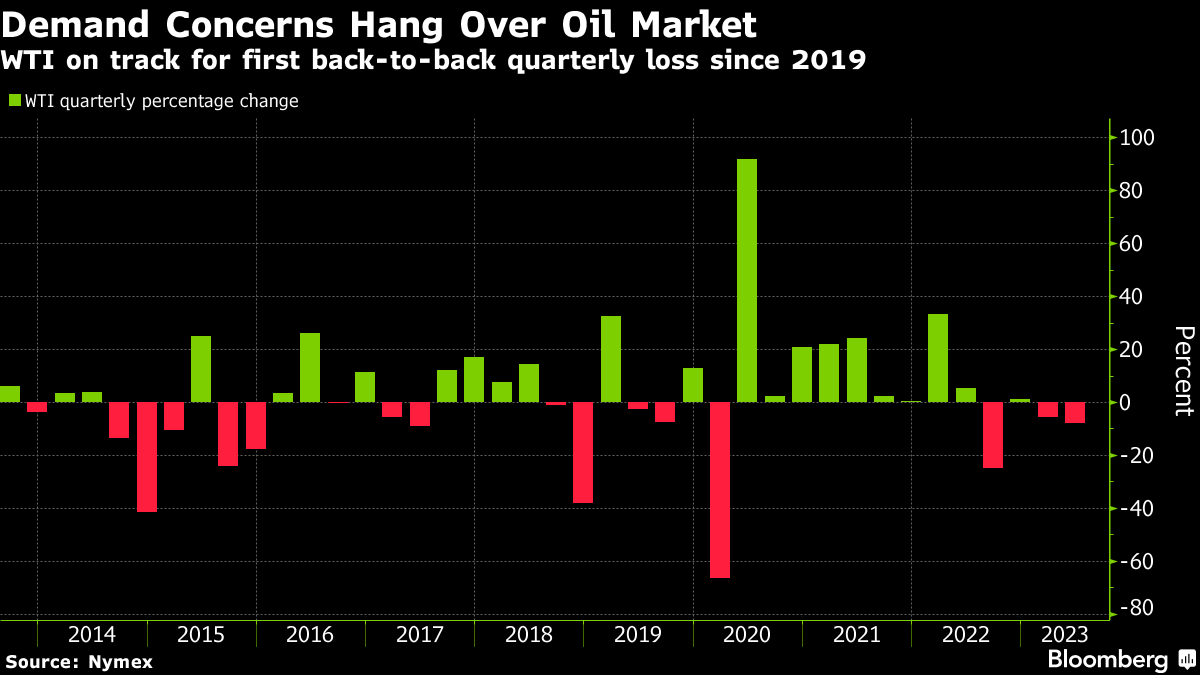 The US benchmark is still on track for its first back-to-back quarterly decline since 2019 as China’s lackluster economic recovery and aggressive monetary tightening by the Federal Reserve weighed on prices. Supply has also been plentiful, bolstered by resilient exports from Russia, despite sanctions.
