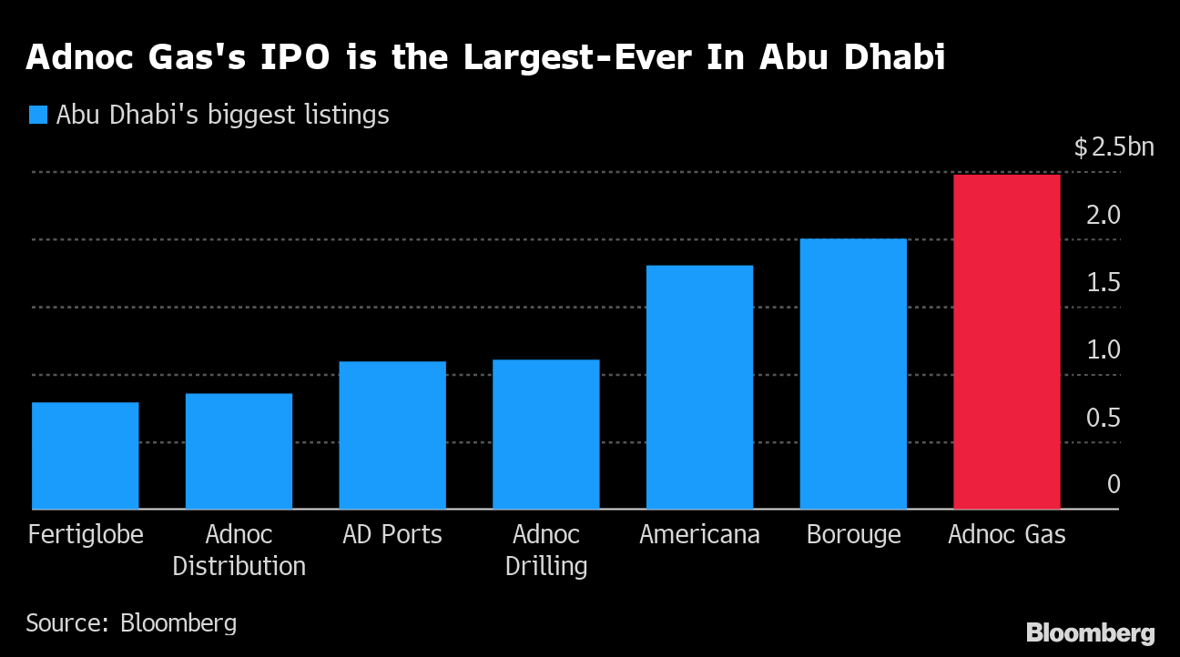 (Bloomberg) -- Abu Dhabi’s main energy company raised $2.5 billion from the initial public offering of its gas business, pulling off the year’s biggest listing and continuing a trend that saw the Middle East emerge as a bright spot for share sales in 2022.