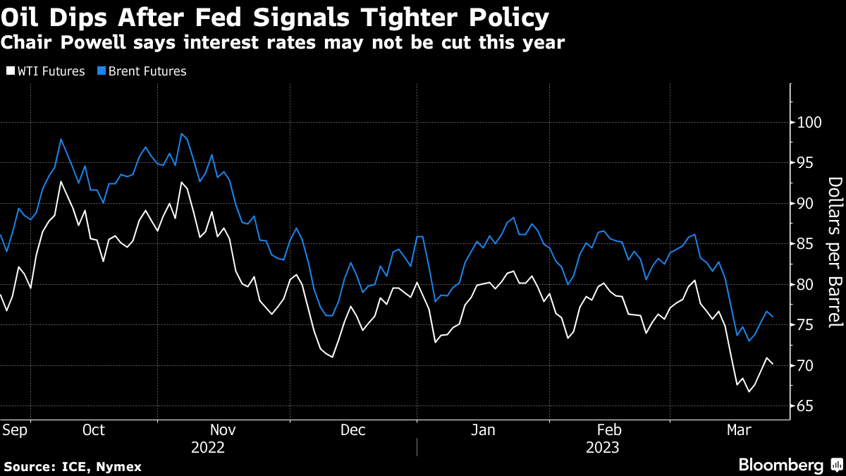 West Texas Intermediate futures for May dipped toward $70 a barrel after rising about 6% in the first three days of the week. Fed Chair Jerome Powell advised that more tightening may be in store after Wednesday’s 25 basis-point rise, and added that rates won’t be cut this year. The comments came less than two weeks after the most severe banking crisis since 2008.