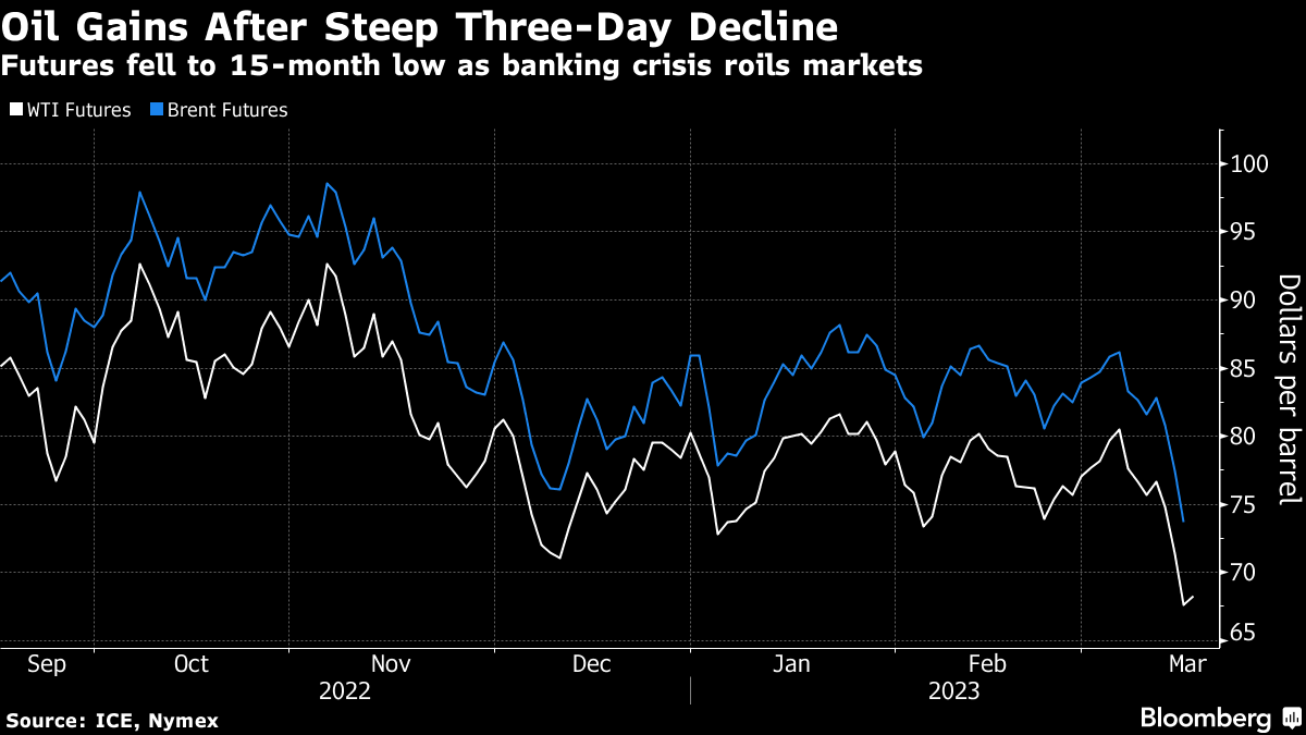 West Texas Intermediate futures traded near $68 a barrel after tumbling around 12% over the previous three sessions. The turmoil whipped up by the collapse of Silicon Valley Bank and fresh upheaval at Credit Suisse Group AG has reverberated across global assets, with selling in oil gathering pace as firms tried to limit their exposure in the options market.