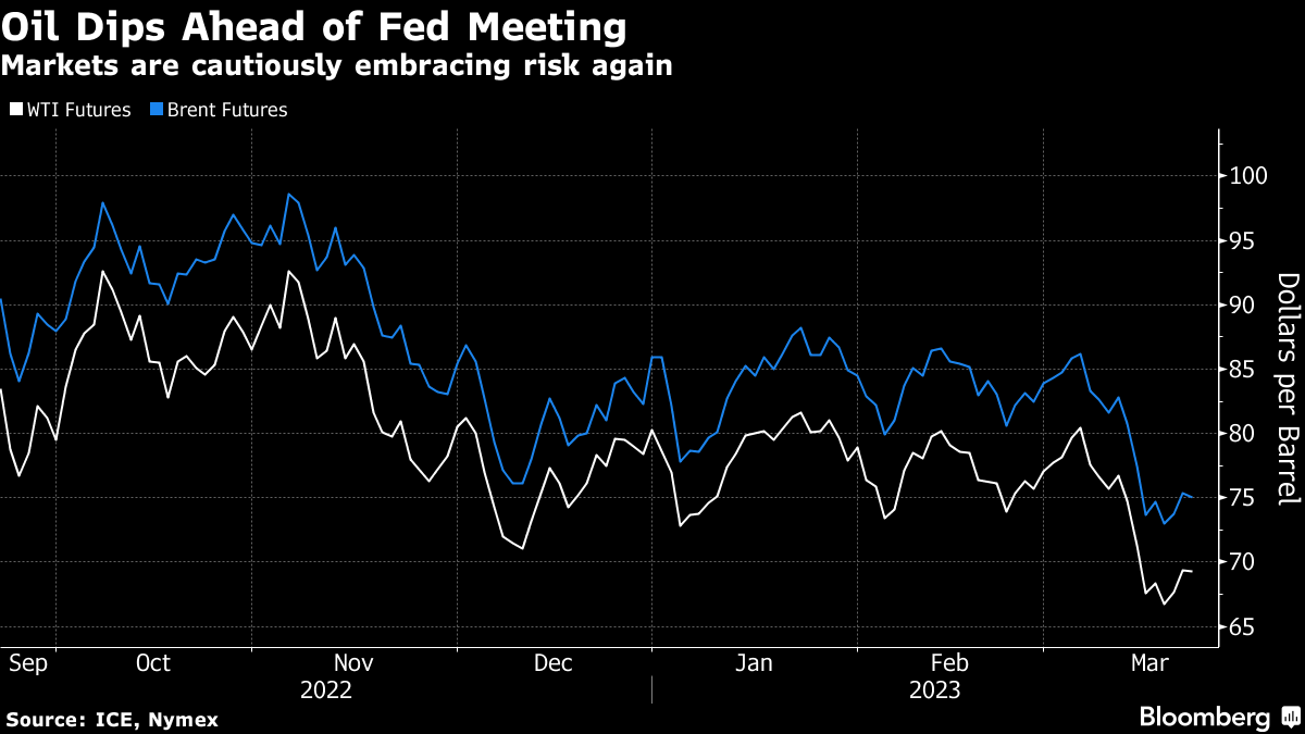 (Bloomberg) -- Oil dipped ahead of an interest-rate decision from the Federal Reserve following a two-day rally that was driven by an easing of concern over banking crises in the US and Europe.
