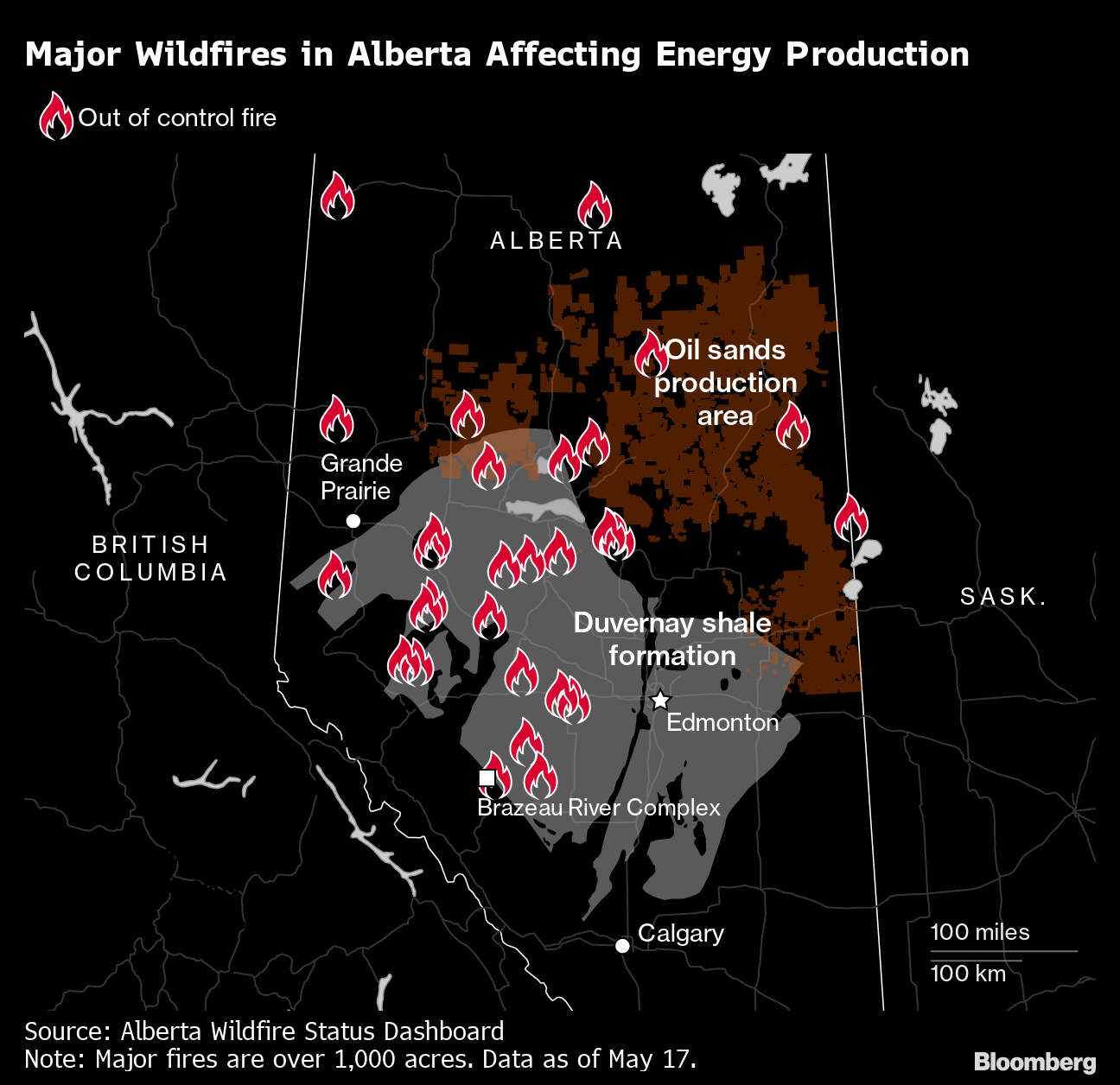 In all, the equivalent of about 240,000 barrels of daily oil and gas production — and perhaps more than 300,000 barrels — has been shut due to the fires, consultant Rystad Energy estimates. A total of 93 wildfires were burning in Alberta as of Friday afternoon, up by one from Thursday, while the number of out-of-control blazes was steady at 26, provincial data show.
