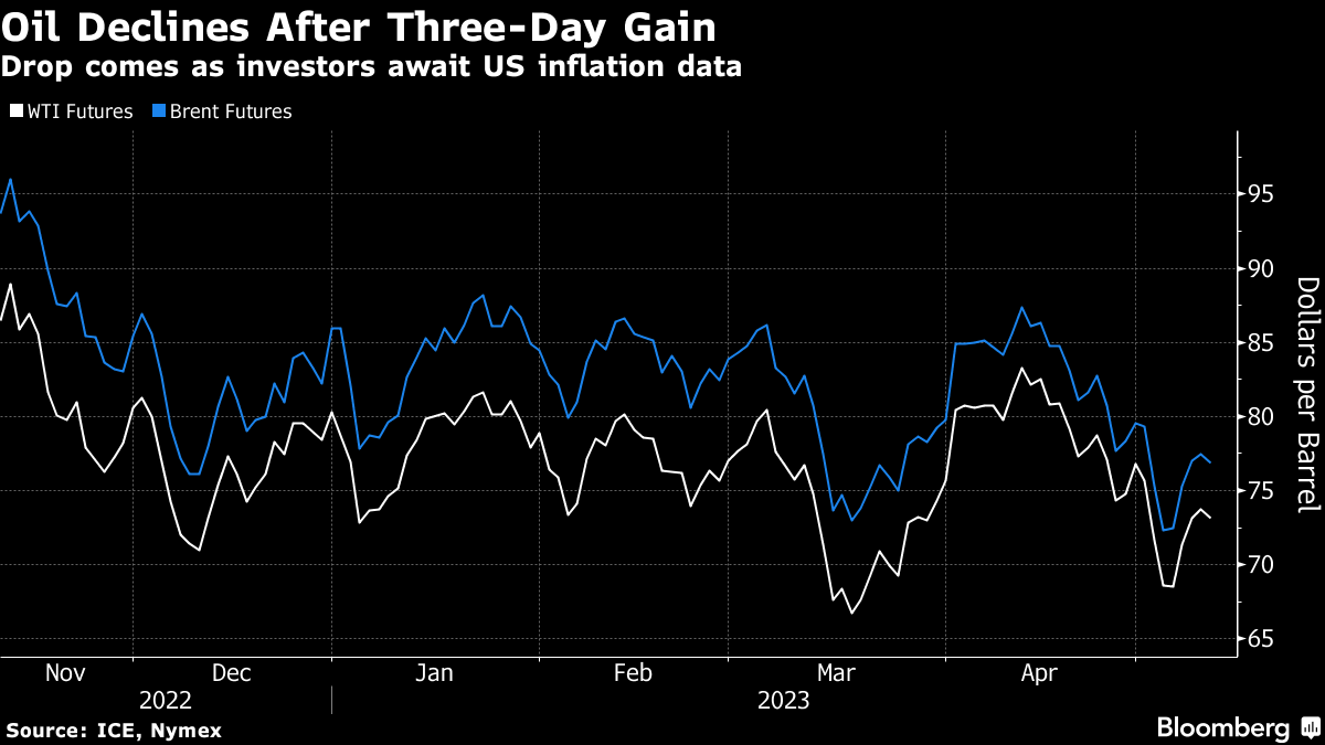(Bloomberg) -- Oil fell with risk assets ahead of a critical US inflation report and as investors digested a mixed report on supplies from an industry group.