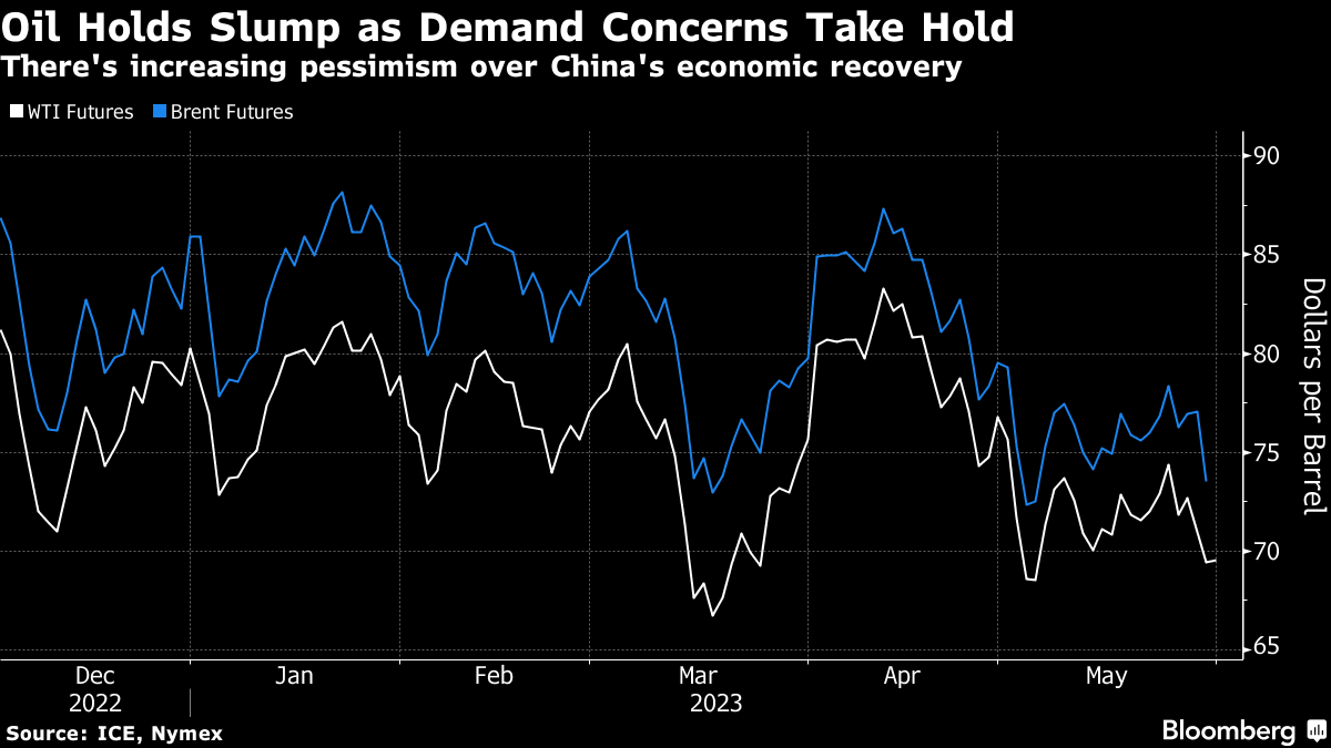 West Texas Intermediate traded below $70 a barrel after settling 4.4% lower on Tuesday from Friday’s close. China’s manufacturing activity showed more signs of weakening in May, adding to concerns over the outlook for demand from the world’s biggest crude importer. Signs of ample supply are being reflected in the spread between contracts for WTI and Brent futures.