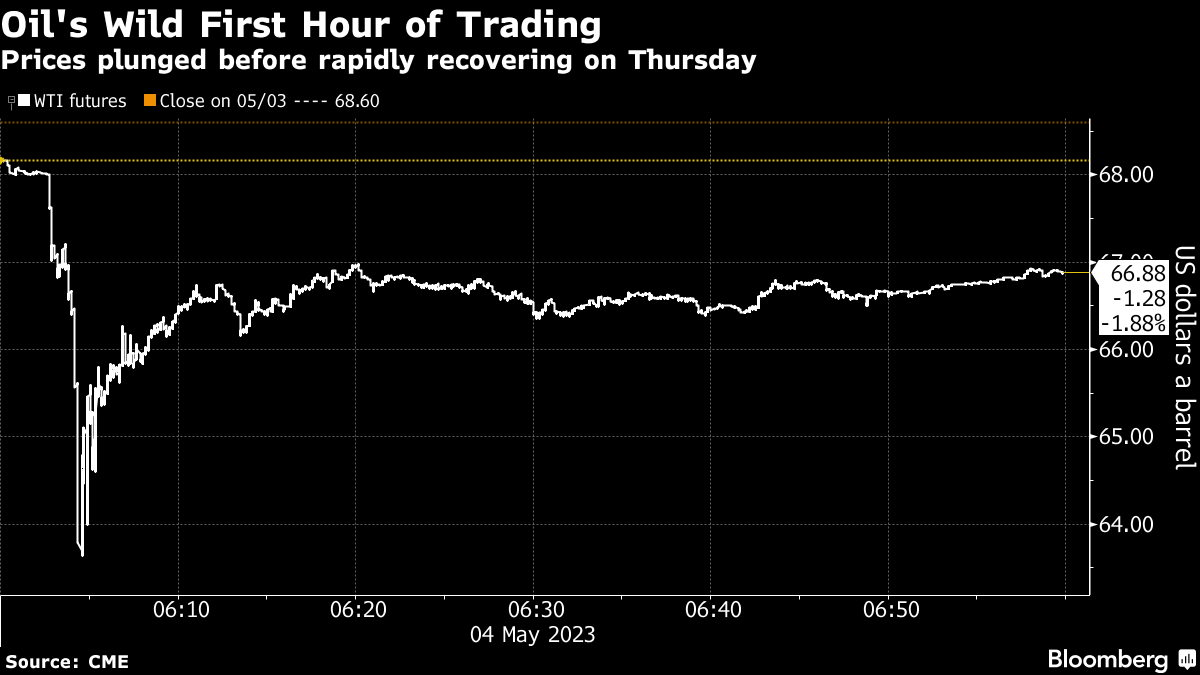 In the fifth minute of the session, more than 3,000 June futures contracts changed hands. Over that span, prices suddenly plunged by more than $3 to hit a nadir of $63.64 a barrel, the lowest intraday level since late 2021. Just three minutes later, WTI futures were back at $66 a barrel, and it then took little more than three hours for prices to eventually turn higher on the day.