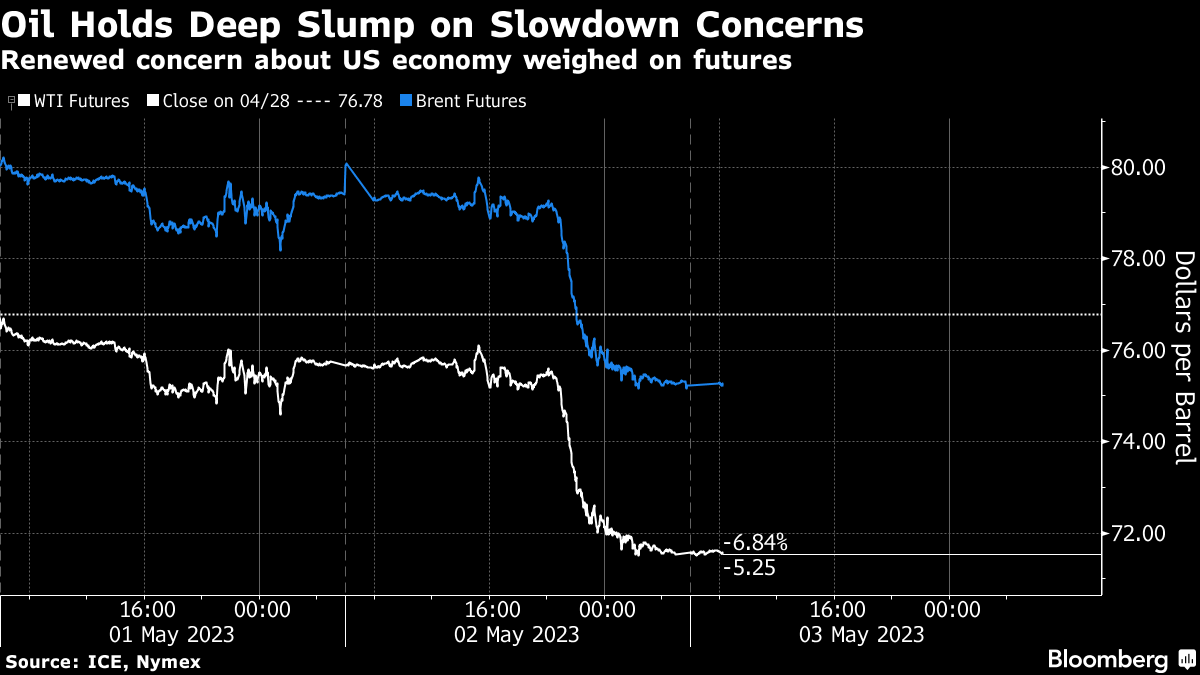 Brent held above $75 a barrel after closing at the lowest in more than five weeks. Crude fell along with other commodities as figures showed a cooling US labor market ahead of what’s expected to be the Federal Reserve’s final interest-rate hike in its current tightening cycle. Renewed concern about the US banking sector added to selling pressure.