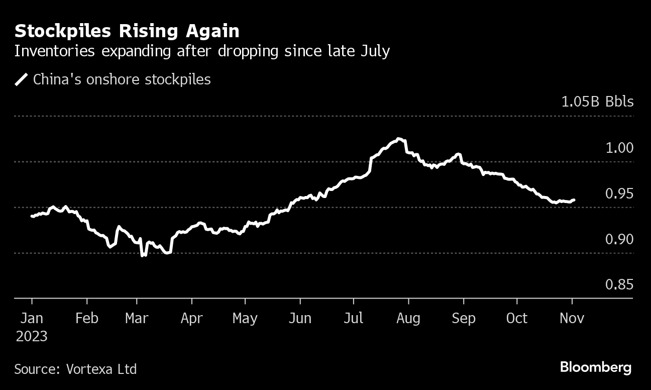 After falling by about 70 million barrels from late July through late-October, China’s onshore crude stockpiles are ticking up again in a sign domestic consumption is flagging, according to data from Vortexa Ltd. They’ve edged higher, albeit modestly, over the last two-and-a-half weeks. However, elevated oil prices will probably limit Chinese purchases for stock-building and the nation will likely draw down inventories, meaning crude imports would “stay more moderate,” Citigroup Inc. said in a note late last month.