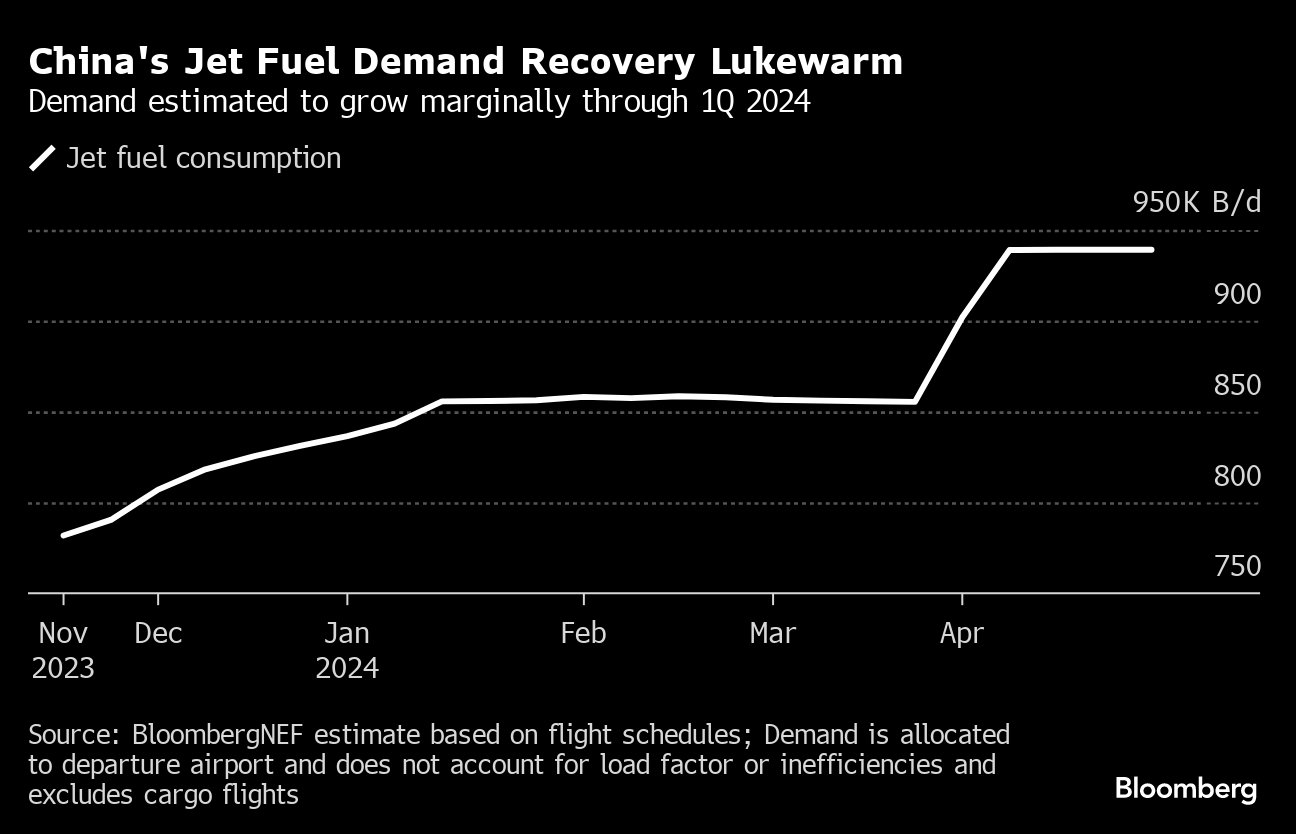 An increase in air travel and jet fuel demand over the Golden Week holidays in early October wasn’t as strong as had been hoped for, evidence that people are reluctant to spend too much on vacations while economic conditions are so uncertain. International flights from China have been particularly slow to recover. Chinese jet fuel consumption is likely to rise gradually through early January, but there won’t be a significant uptick until the start of the second quarter, according to a forecast from BloombergNEF.