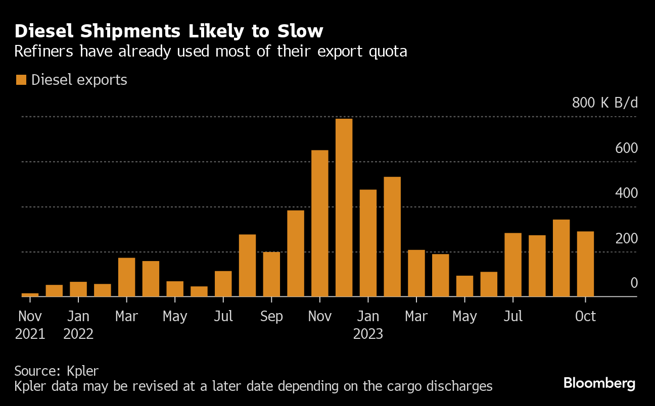 China’s oil-product exports will plunge by 40% in November from October, according to OilChem. Refiners have already used up most of their fuel export quotas for 2023, and the government told them in late September not to expect any more this year. That will likely lead to a major drop in diesel shipments, which account for most of the country’s overseas fuel sales, in the last couple of months of the year.