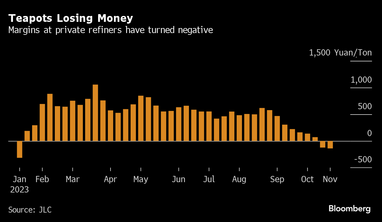Higher crude prices and weakening demand for diesel and gasoline have hit profitability at China’s independent refiners over the past couple of months. Margins at the plants known as teapots, which account for about a quarter of the country’s processing capacity, turned negative in late October for the first time since early January, according to local industry consultant JLC. Run rates at facilities in Shandong province, where most of the teapots are located, were around 57% of capacity in the week through Nov. 3, the lowest since May 2022, OilChem data show.