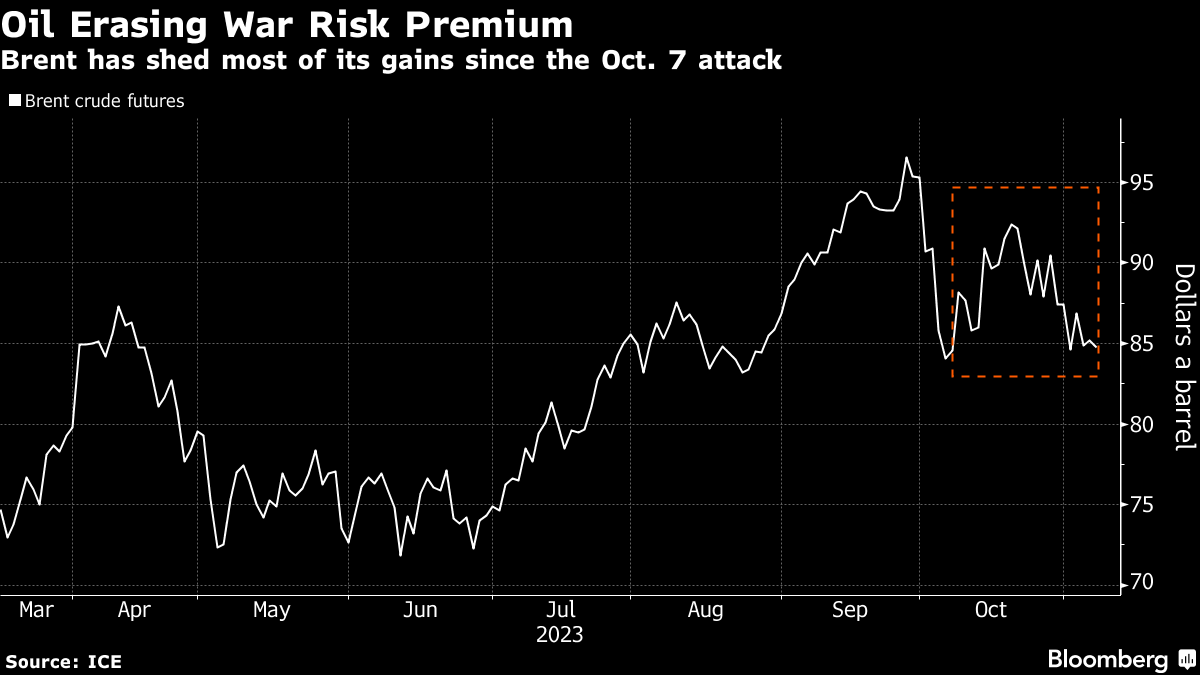 Crude is struggling to find a direction after giving up gains following the Oct. 7 attack by Hamas on Israel, with the conflict yet to threaten supplies from the Middle East, the source of about a third of the world’s oil. Saudi Arabia and Russia, meanwhile, are keeping a tight grip on supplies in the face of a shaky demand outlook, particularly in China, the biggest importer, and Europe.