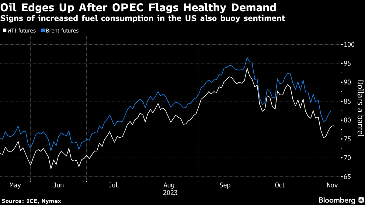 Global benchmark Brent traded near $83 a barrel, and is up around 4% since Wednesday’s close. West Texas Intermediate was close to $79. Demand is robust, and “overblown negative sentiment” has been dominating the market, OPEC said in a monthly report on Monday. The American Automobile Association said the US Thanksgiving travel period will be the busiest since 2019.