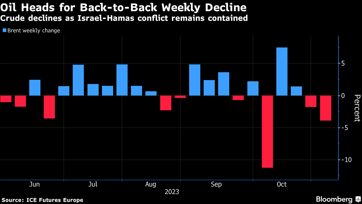 (Bloomberg) -- Oil was set for a second weekly loss as the Israel-Hamas war remained contained and clouds appeared on the demand horizon.