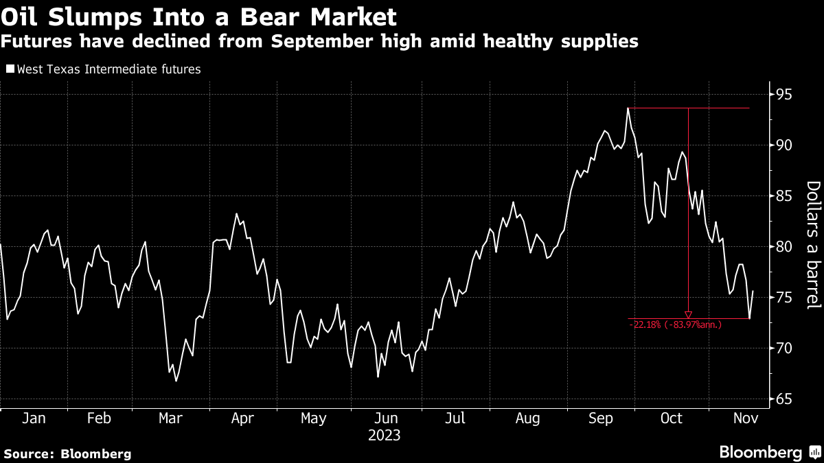 Still, US benchmark WTI fell 1.7% for the week, its fourth straight weekly retreat. It’s down 19% from its highest close of the year in September.