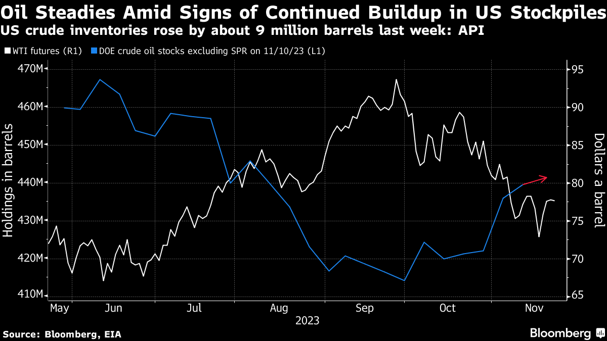 (Bloomberg) -- Oil steadied, with signs of another stockpile build in the US coming ahead of an OPEC+ meeting on supply over the weekend.