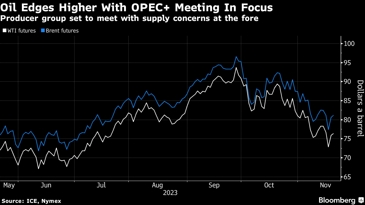 (Bloomberg) -- Oil edged higher after a two-day swing as investors looked ahead to an OPEC+ meeting on supply policy that will shape market balances into 2024, and a weaker US dollar made commodities more attractive.