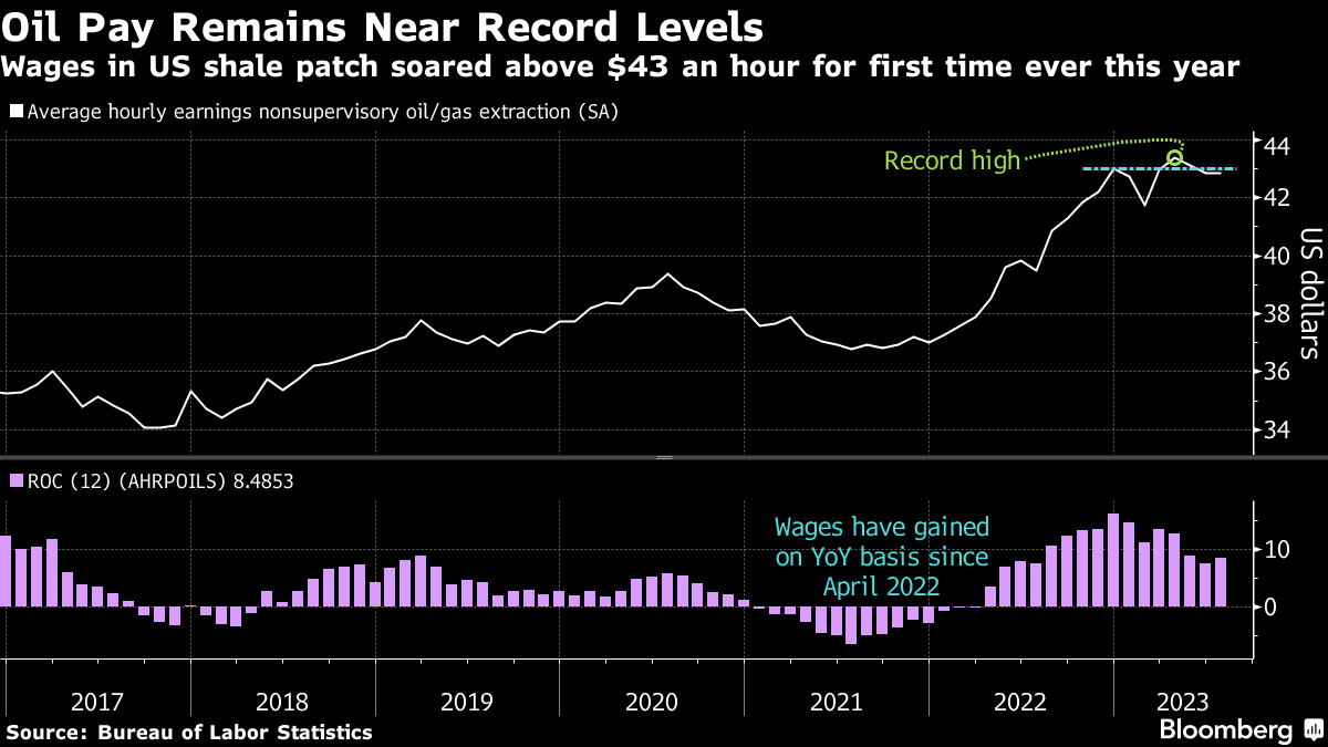 Inflation pressures in the US shale patch are far from abating. A survey last week from the Federal Reserve Bank of Dallas — a widely followed quarterly report — showed that most oil executives polled now expect drilling and fracking expenses to climb next year. That’s sobering news in light of near-record labor costs and other expenses. Friday’s monthly US payrolls report will shed further light on the state of the shale jobs market. Earlier this year, average hourly earnings for front-line oil-and-gas workers topped $43 an hour for the first time ever.