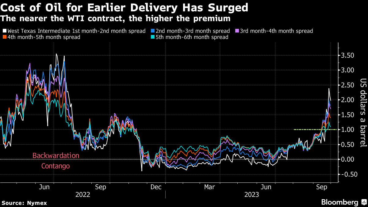 Oil is fresh off its biggest quarterly advance since early 2022, a rally supported by production cuts in both Saudi Arabia and Russia and record demand. Tightening crude supplies have pushed up the premium that traders are paying for West Texas Intermediate deliveries a month earlier, with every pair of futures contracts through the next six months above $1 a barrel. The move deeper into a market structure known as backwardation highlights ongoing inventory concerns, forcing the market to bid up prompt contracts. WTI and Brent futures settled lower in Monday trading.
