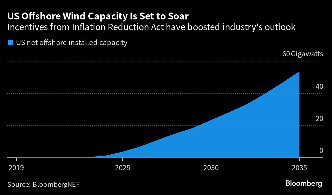 The future of US offshore wind is at a key inflection point, with construction impaired by soaring costs and ongoing supply-chain hurdles. The American Clean Power Association will host the Offshore Windpower Conference on Tuesday and Wednesday with major developers including Orsted A/S, Avangrid Inc. and Equinor ASA, as well as government officials, in attendance. Thanks to incentives provided by President Joe Biden’s landmark climate law — the Inflation Reduction Act — cumulative offshore wind installed capacity is set to soar to more than 53 gigawatts by 2035, according to BloombergNEF. That compares with just 42 megawatts at the end of 2022.
