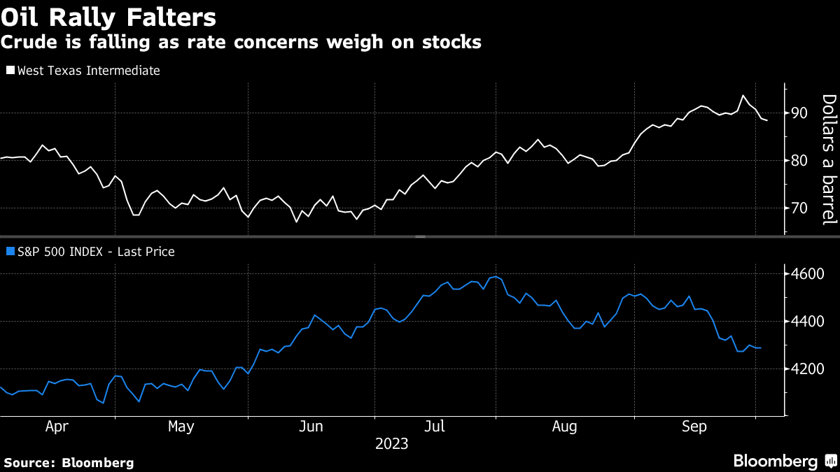 West Texas Intermediate traded near $88 a barrel after declining by 2.2% in the previous session. A global rout in sovereign bonds and shares extended into Tuesday, while the dollar strengthened as traders digested messaging that the Federal Reserve will need to leave borrowing costs higher for longer.