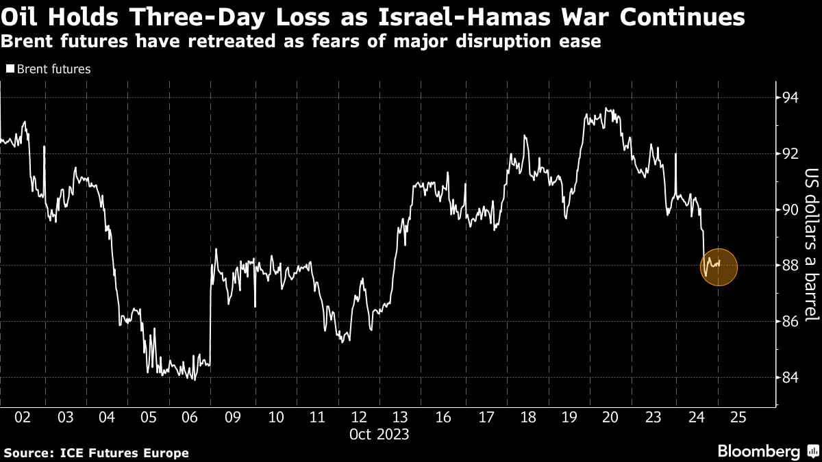 Global benchmark Brent was near $88 a barrel, erasing about half of the gains since Hamas’ attack on Oct. 7, while West Texas Intermediate traded below $84 a barrel. The US and Saudi Arabia agreed to pursue diplomatic efforts to maintain stability across the Middle East, the White House said Tuesday, helping to ease fears of major disruptions to the oil market.
