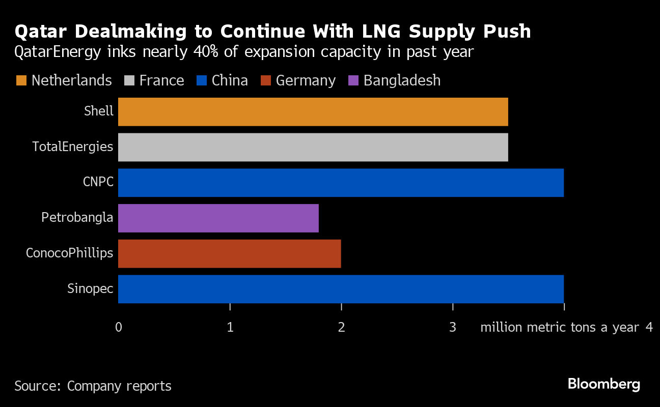 Starting in 2026, QatarEnergy will deliver as much as 3.5 million tons of LNG a year to Rotterdam’s Gate import terminal for 27 years under two deals, the Middle Eastern company said in a statement on Wednesday. That comes a week after the producer signed a similar contract with France’s TotalEnergies SE, and indicates that more deals could be on the horizon.