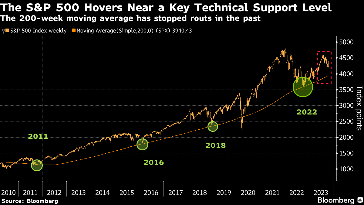 More than two-thirds of stocks for companies in the S&P 500 index are trading below their 200-day moving averages, according to an analysis by Bloomberg Intelligence. That’s a sign of widespread pain for stock prices, after many companies have posted lackluster earnings amid interest rates that are high and bond yields that keep creeping up.