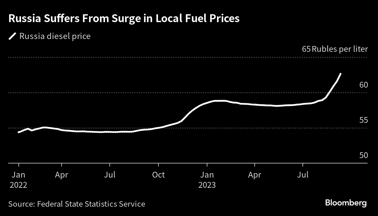 (Bloomberg) -- With the northern hemisphere winter approaching and global diesel markets already tight, Russia has banned exports of the fuel that’s used for transportation, heating and industrial processes. Many analysts expect the halt to be temporary, but others see it as another example of Moscow weaponizing energy exports, as its invasion of Ukraine enters a 20th month.