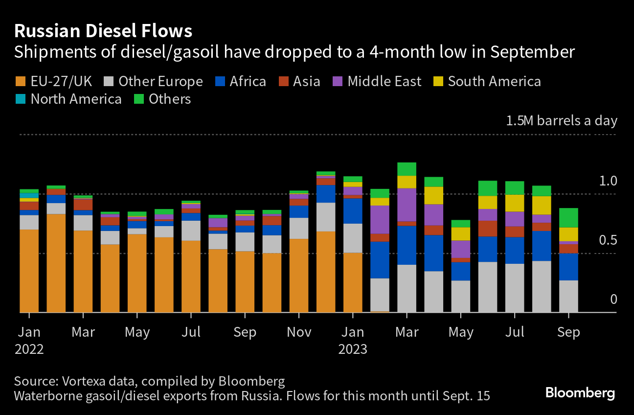 Russia plays an important role in the global diesel market. So far this year, the nation was the world’s single biggest seaborne exporter of diesel-type fuel, narrowly ahead of the US, according to Vortexa data compiled by Bloomberg. It shipped more than 1 million barrels a day from January to mid-September.