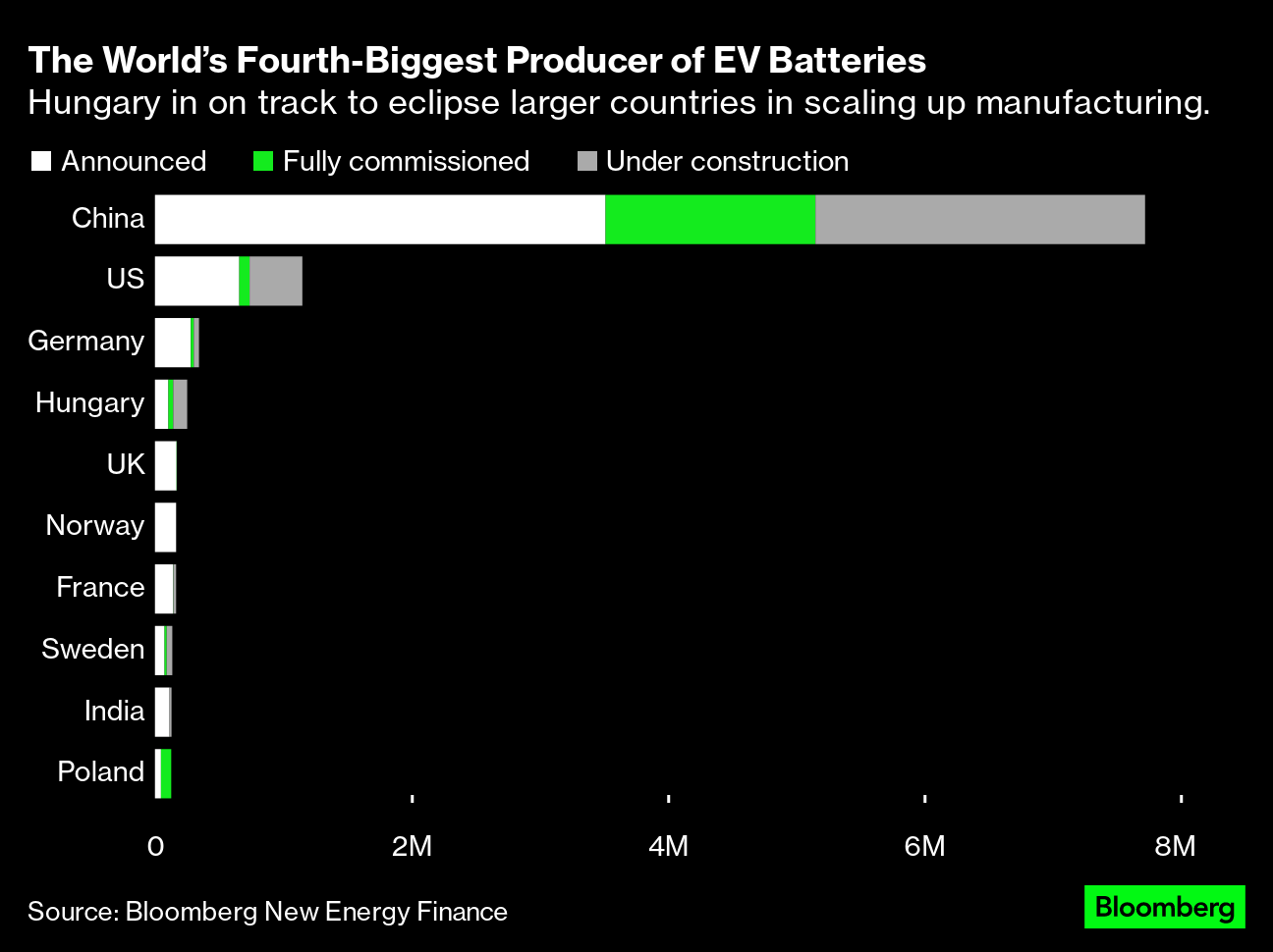 In just a few years, the country of less than 10 million people is projected to become the fourth-largest producer of batteries globally, after China, the US and Germany, according to BloombergNEF data.