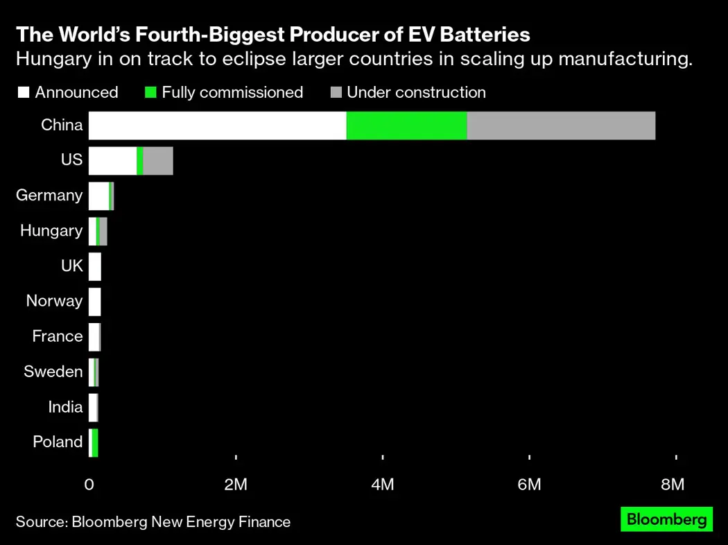 The EU has set 2035 as the deadline to stop the sale of new petrol and diesel cars, forcing manufacturers to go electric. Factories that fail to transition risk being shuttered. That has boosted Hungary’s appeal by drawing in primarily Chinese and South Korean battery makers. They can be next to their biggest customers inside the world’s largest trading bloc.