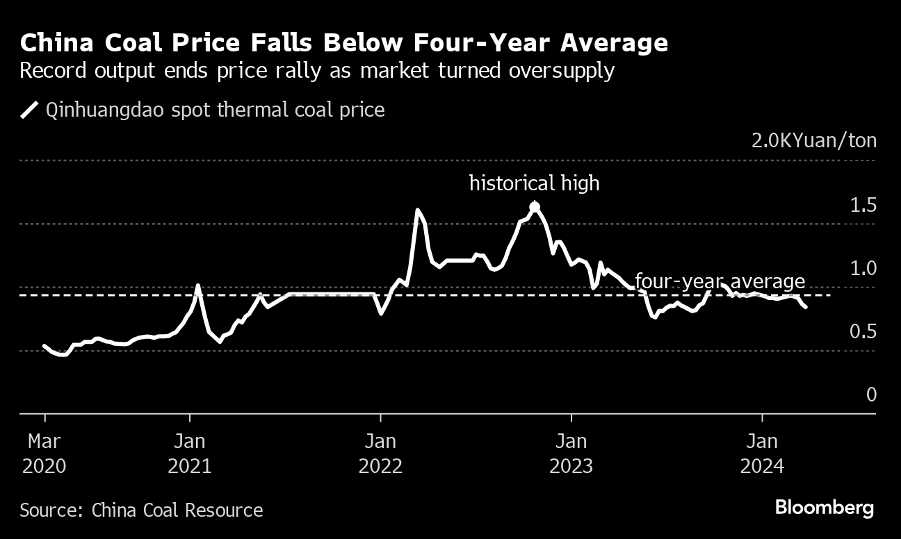 The country’s benchmark thermal coal price is down by around a quarter since early October as record output coincided with lackluster industrial demand and a relatively mild winter. The declines have steepened since late February, with prices dropping 11% to 825 yuan ($114) a ton over the last five weeks.