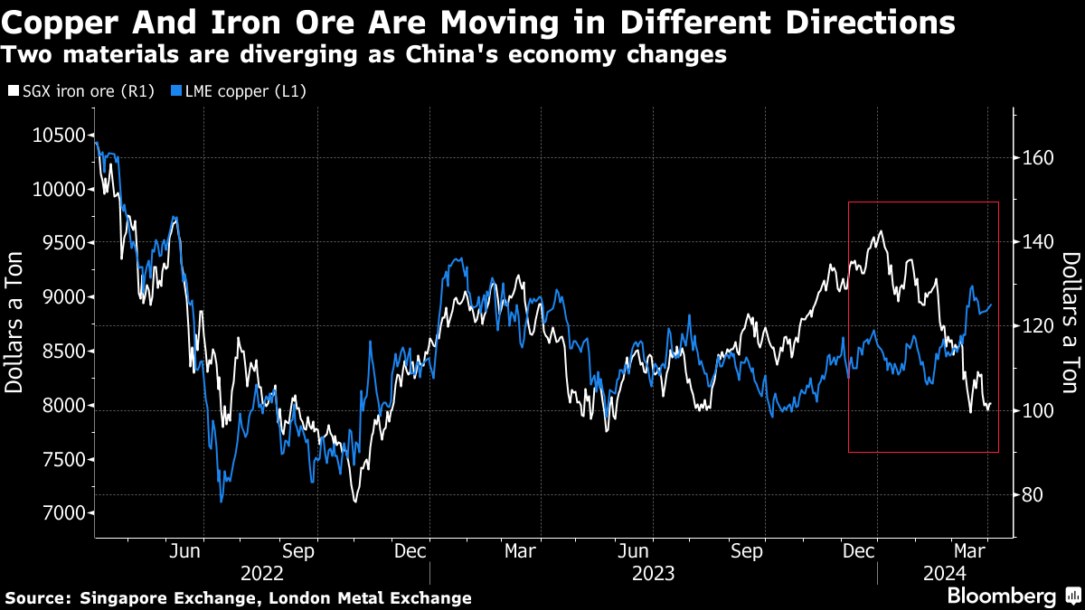 (Bloomberg) -- Iron ore’s reset to around $100 a ton is indicative of a broader reshaping of China’s commodities markets that favors the new economy over the old.