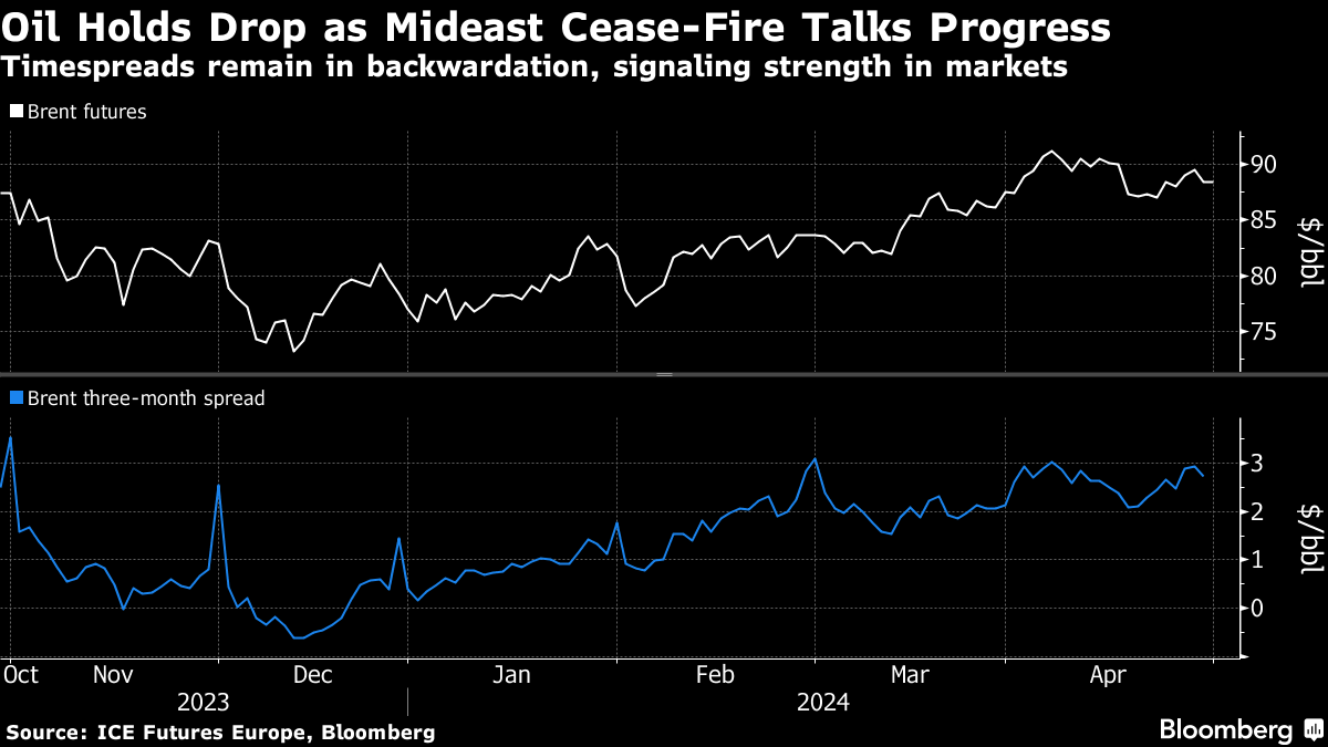 Brent crude traded above $88 a barrel after closing 1.2% lower on Monday, with West Texas Intermediate under $83. The gap between Israel and Hamas on an agreement to release hostages has narrowed in recent weeks and a deal was close, according to two people familiar with the deliberations.