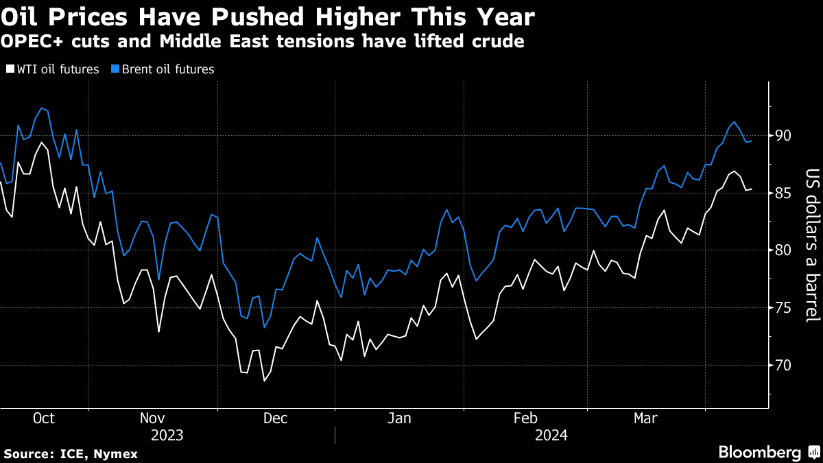 Oil is still up 19% this year as OPEC+ cuts supply and geopolitical tensions across the Middle East present bullish tailwinds. The market is bracing for Iran’s response to a suspected Israeli attack on its consulate in Syria last week and Hezbollah has warned it’s ready for war.