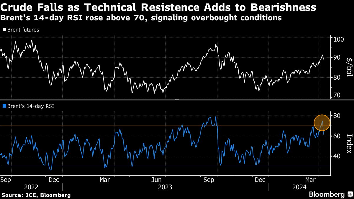 Brent futures tumbled by as much as 2.6% before clawing back some losses to trade below $90 a barrel. West Texas Intermediate was under $86. Oil has rallied recently on escalating geopolitical tensions and supply shocks, raising the prospect of the global benchmark reaching triple figures.