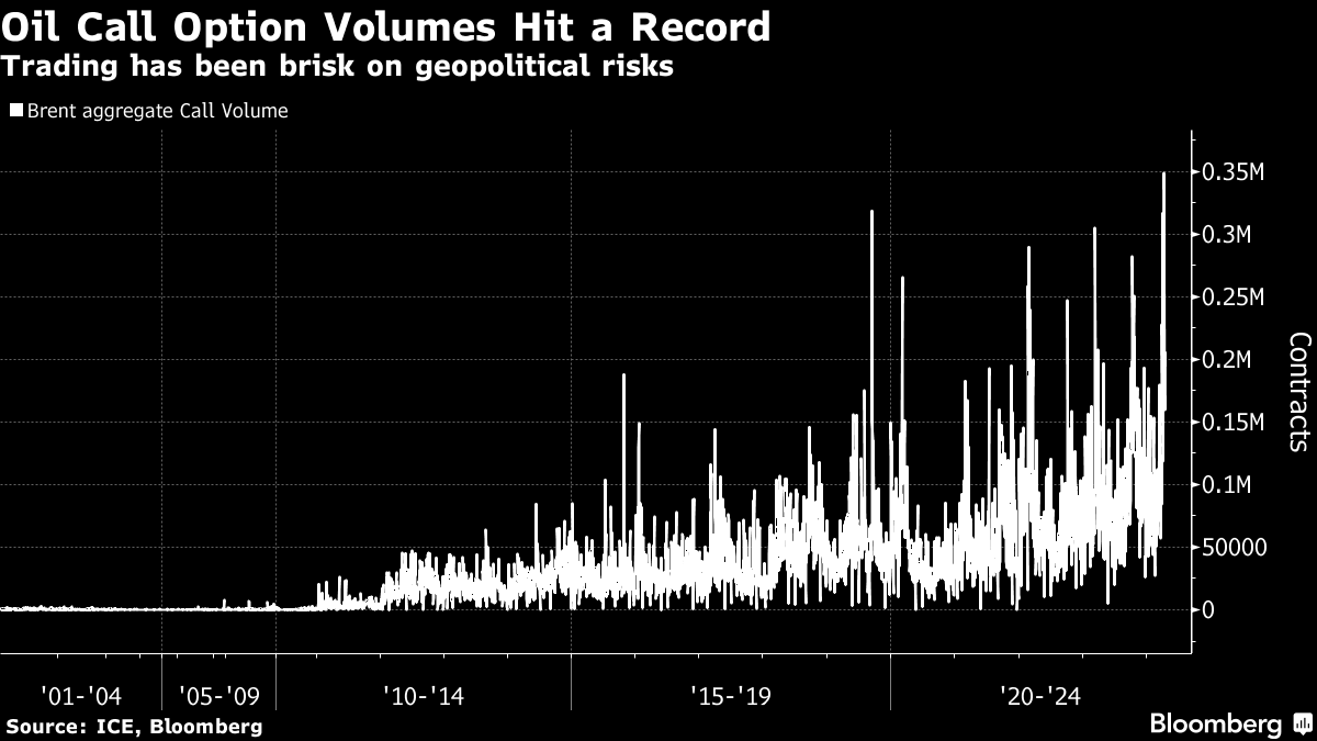That’s only one side of the story, though. Intraday, prices are seeing some of their biggest swings in months and, in the options market, speculators have been snapping up contracts at a record pace to profit from any spike higher in futures.