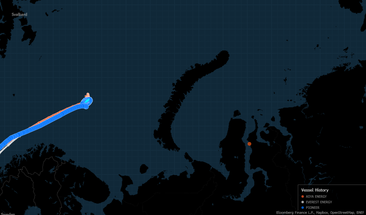 The Everest Energy, part of a suspected “dark fleet” of vessels assembled by Moscow to take gas to willing buyers, has halted in the Barents Sea northeast of Norway, according to ship-tracking data compiled by Bloomberg.