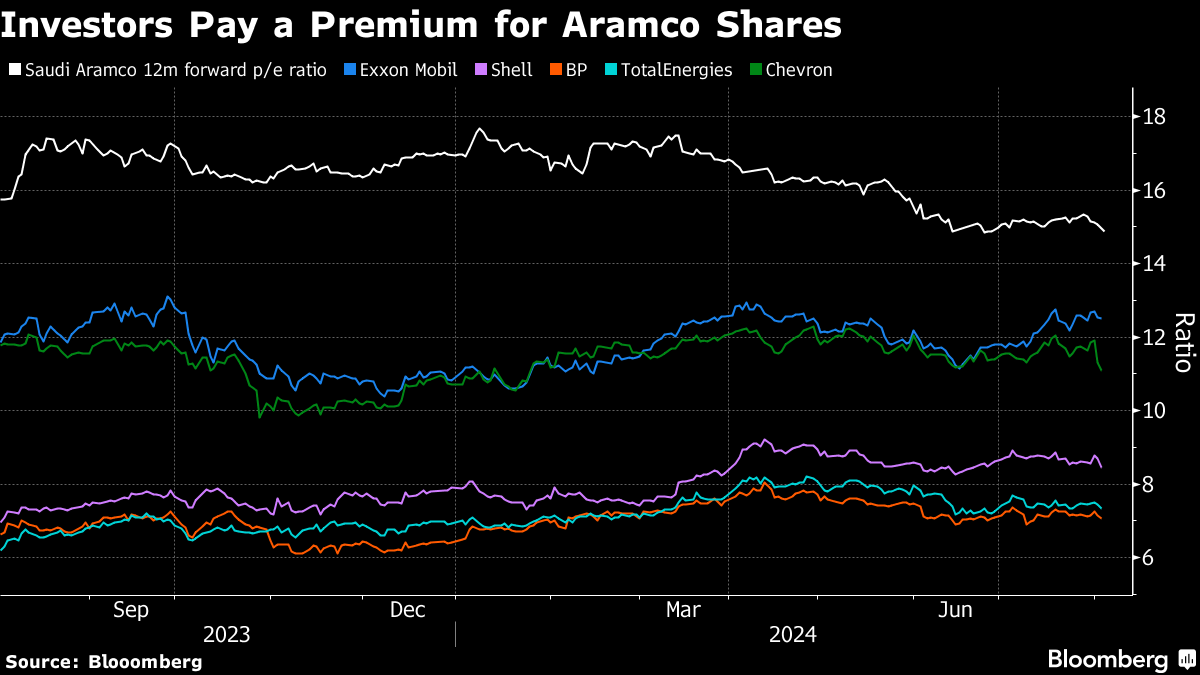 Even after this year’s drop in the stock price, investors still value the Saudi company at 15 times estimated earnings, double the valuation of BP Plc and Shell.