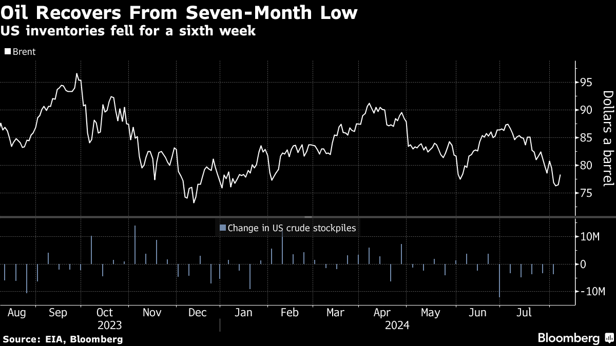 Oil has rebounded after falling to a seven-month low on Monday amid a rout in global equity markets. A halt to crude production from Libya’s biggest field has helped underpin the gains, while a rare cross-border attack by Ukrainian troops into Russia added to geopolitical tensions.